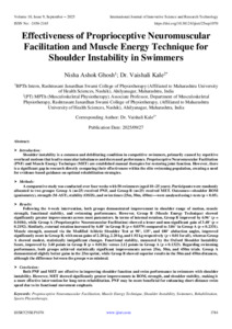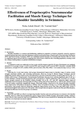 Ghosh, Nisha Ashok and Kale, Dr. Vaishali (2025) Effectiveness of Proprioceptive Neuromuscular Facilitation and Muscle Energy Technique for Shoulder Instability in Swimmers. International Journal of Innovative Science and Research Technology, 10 (9): 25sep1070. pp. 1784-1792. ISSN 2456-2165