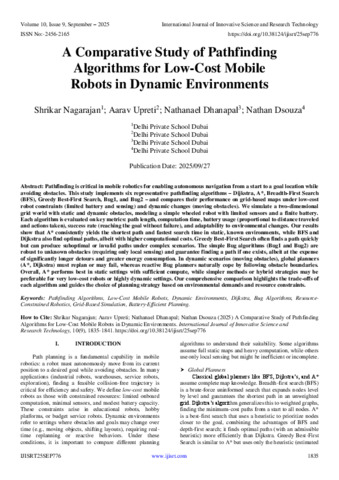 Nagarajan, Shrikar and Upreti, Aarav and Dhanapal, Nathanael and Dsouza, Nathan (2025) A Comparative Study of Pathfinding Algorithms for Low-Cost Mobile Robots in Dynamic Environments. International Journal of Innovative Science and Research Technology, 10 (9): 25sep776. pp. 1835-1841. ISSN 2456-2165