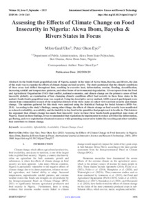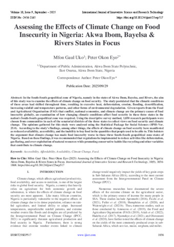 Uko, Mfon Gaul and Eyo, Peter Okon (2025) Assessing the Effects of Climate Change on Food Insecurity in Nigeria: Akwa Ibom, Bayelsa & Rivers States in Focus. International Journal of Innovative Science and Research Technology, 10 (9): 25sep517. pp. 1856-1868. ISSN 2456-2165