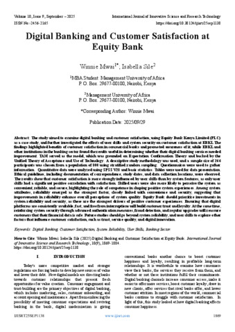 Mwai, Winnie and Sile, Isabella (2025) Digital Banking and Customer Satisfaction at Equity Bank. International Journal of Innovative Science and Research Technology, 10 (9): 25sep1138. pp. 1869-1884. ISSN 2456-2165