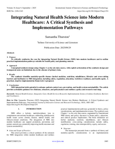 Thurston, Samantha (2025) Integrating Natural Health Science into Modern Healthcare: A Critical Synthesis and Implementation Pathways. International Journal of Innovative Science and Research Technology, 10 (9): 25sep1254. pp. 1885-1887. ISSN 2456-2165