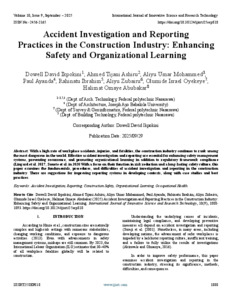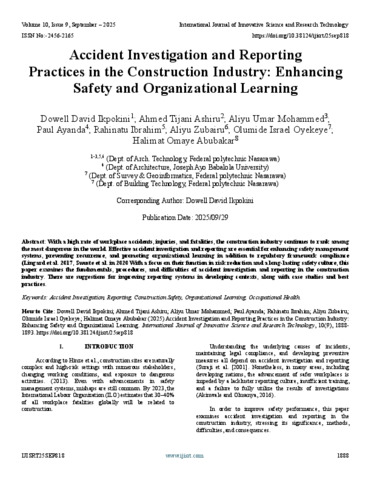 Ikpokini, Dowell David and Ashiru, Ahmed Tijani and Mohammed, Aliyu Umar and Ayanda, Paul and Ibrahim, Rahinatu and Zubairu, Aliyu and Oyekeye, Olumide Israel and Abubakar, Halimat Omaye (2025) Accident Investigation and Reporting Practices in the Construction Industry: Enhancing Safety and Organizational Learning. International Journal of Innovative Science and Research Technology, 10 (9): 25sep818. pp. 1888-1893. ISSN 2456-2165